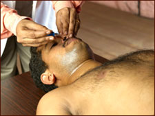 non-stop continuous stream of the prescribed liquid medicine is gently poured on his forehead from a